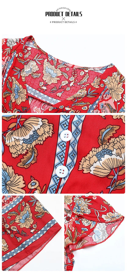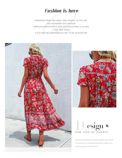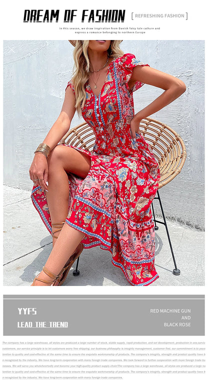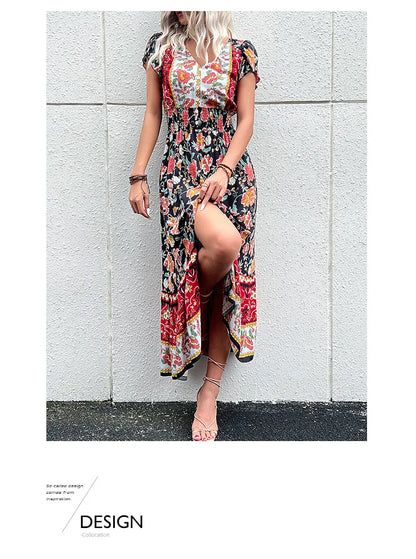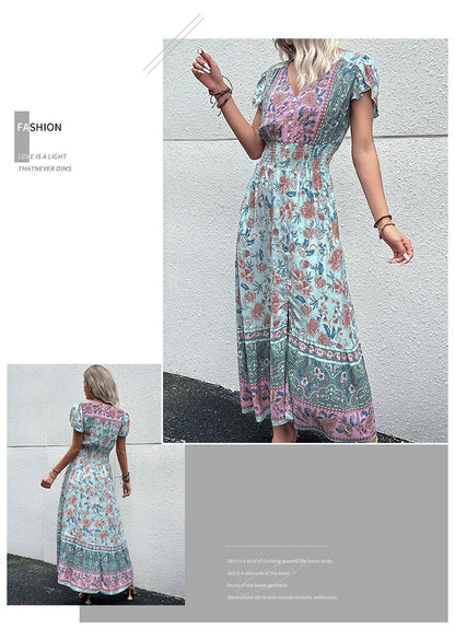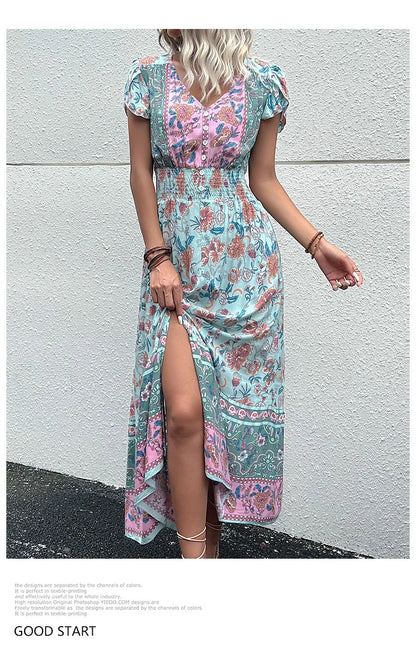 Short Sleeves V Neck Vintage Floral Boho Printed Slit Midi Dresses A Line Bohemian Summer Beach Dress