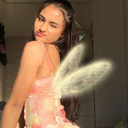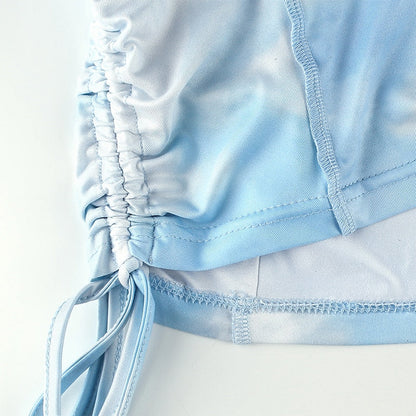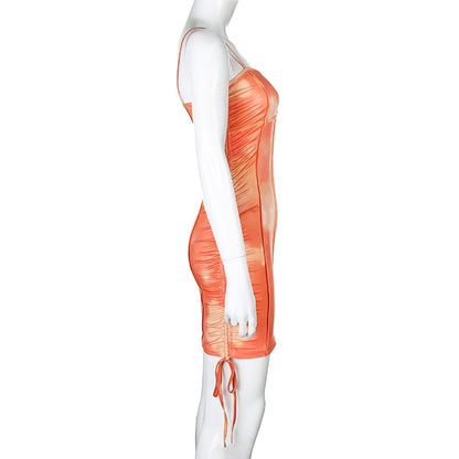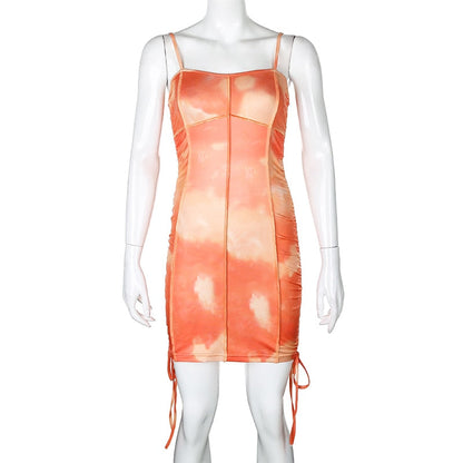 Spaghetti Strap Tie Dye Ruched Summer Drawstring Patchwork Bodycon Club Party Dress