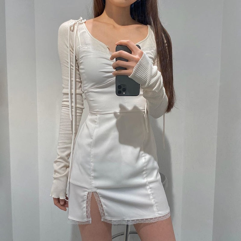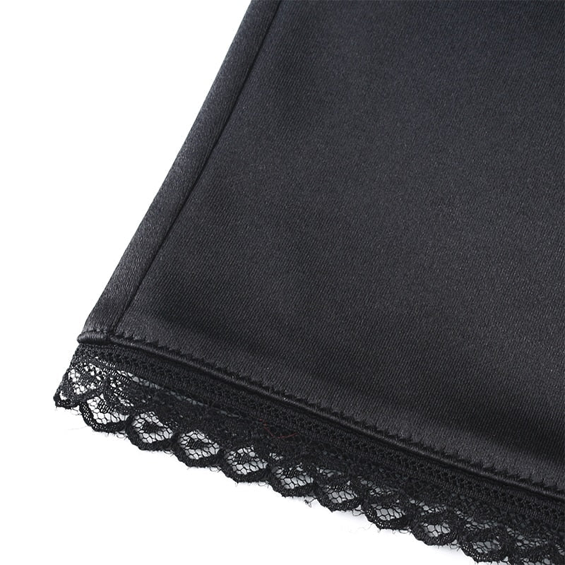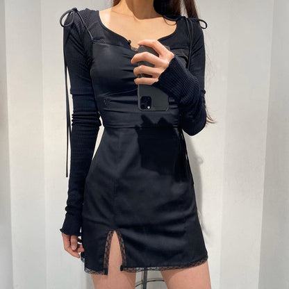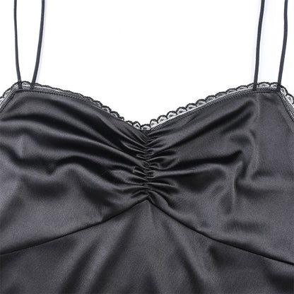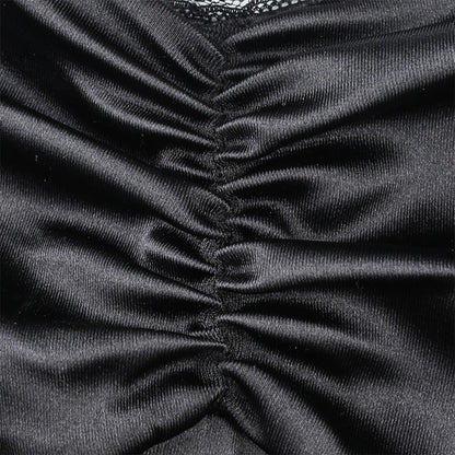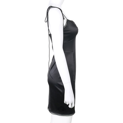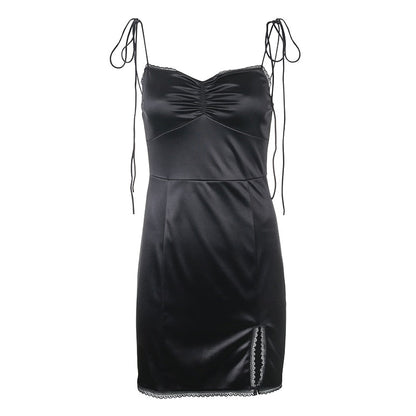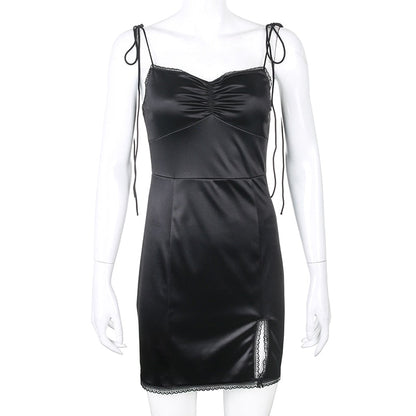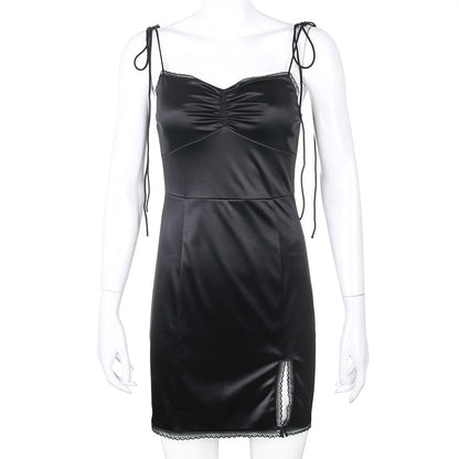 Strappy Satin Ruched Black Mini Lace Spliced Side Split Sundress Backless Dresse