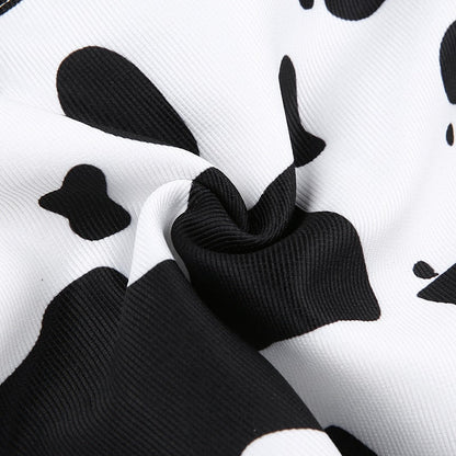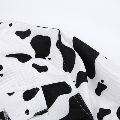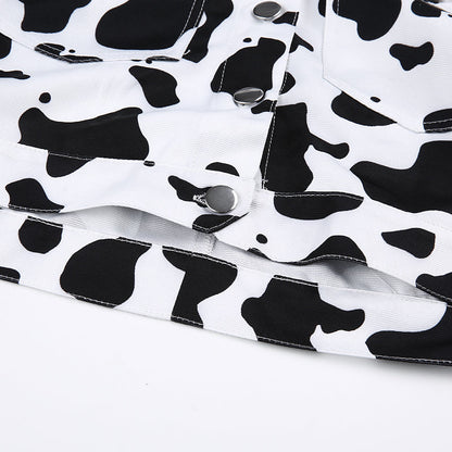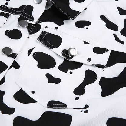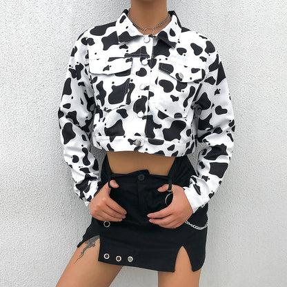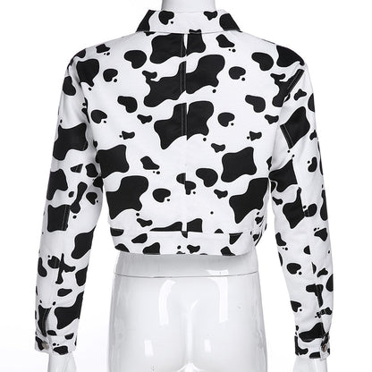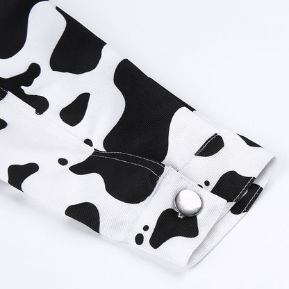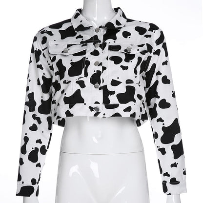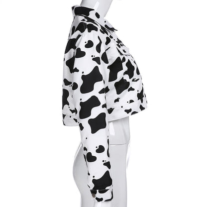 Streetwear Cow Print Cropped Casual Buttons Coat Women Cardigan Spring Autumn Basic Jacket
