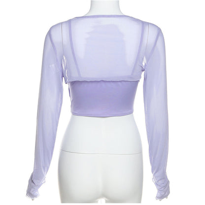 Summer Long Sleeve Crop Top T-shirt Bustier Corset And Mesh Top Two Piece Tee Shirt Sexy Fashion Y2K Top