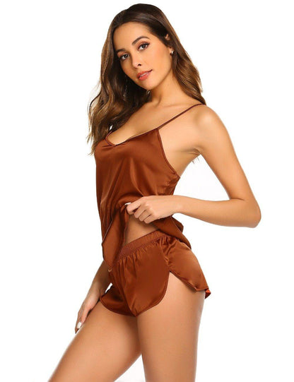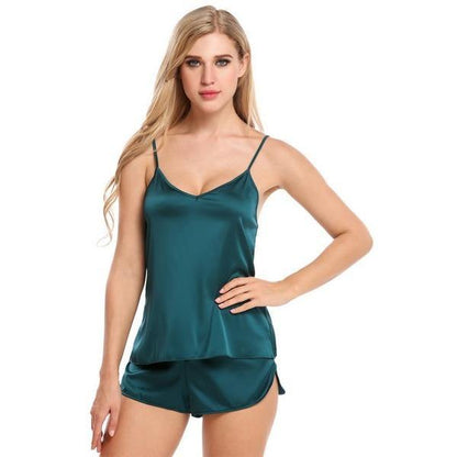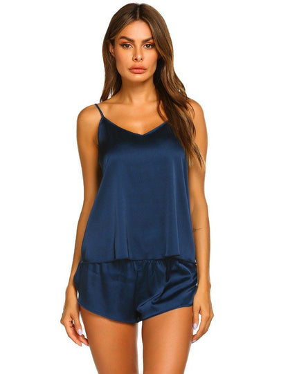 Summer Sleepwear Pyjamas Set Solid Adjustable Strap Cami Top Shorts Satin Loose Female Nightwear
