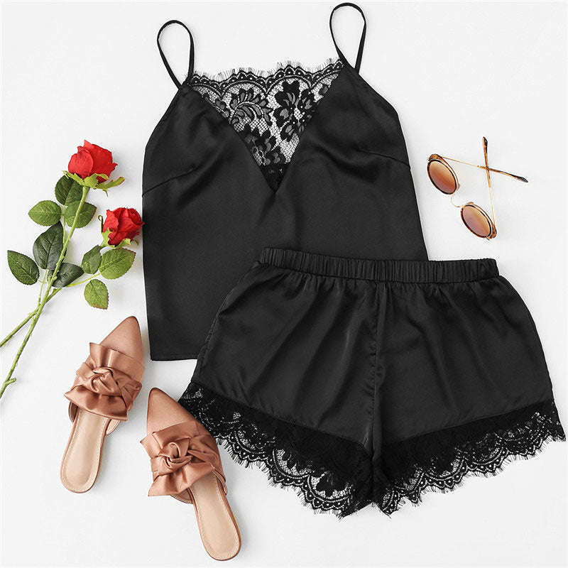 Summer Sleeveless Spaghetti Strap Nightwear Lace Trim Satin Cami Top and Shorts Pyjama Set