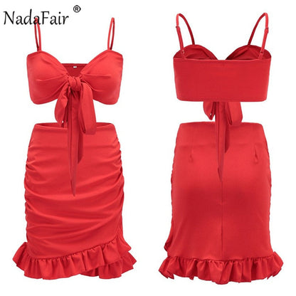 Two Pieces Set Women Ruffles Bow Casual Beach Summer Red Off Shoulder Sexy Club Bodycon Wrap Mini Party Dress