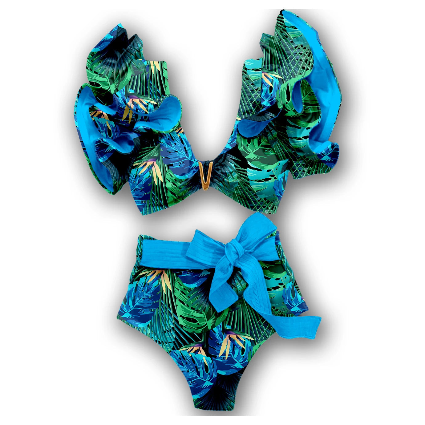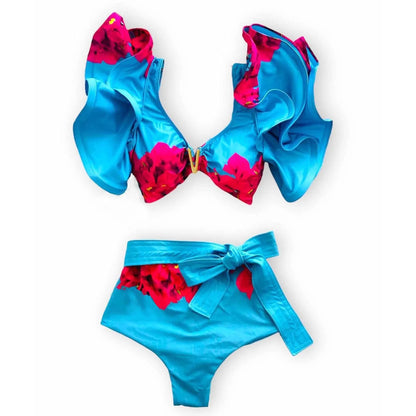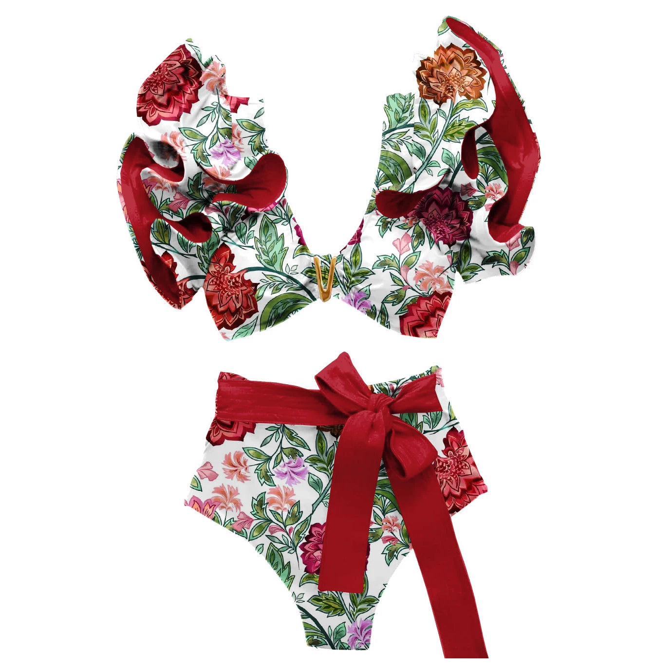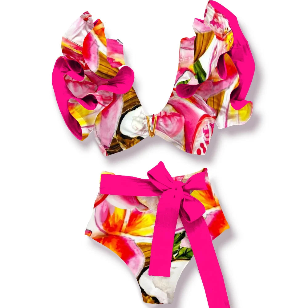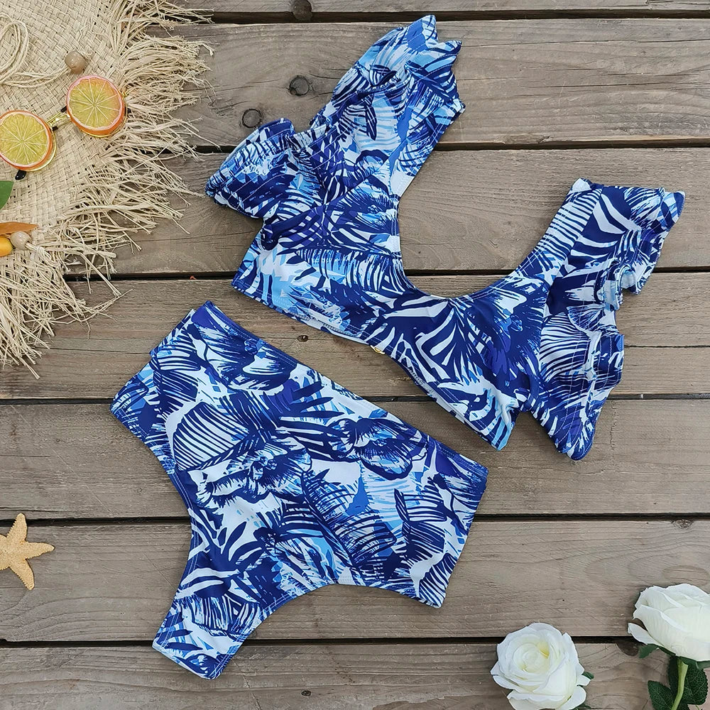 V-Neck High Waist Bikini Shoulder Ruffled Printed Swimsuit Two Piece Swimwear Bathing Suits