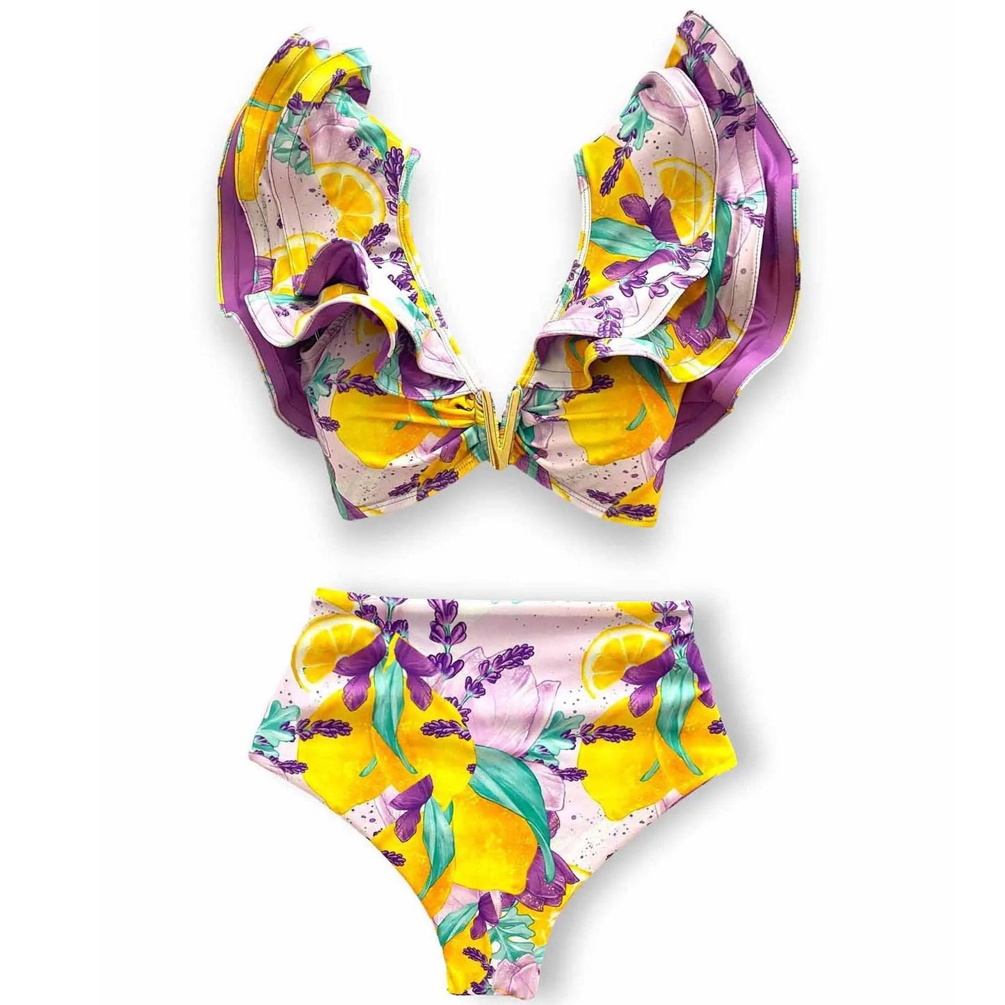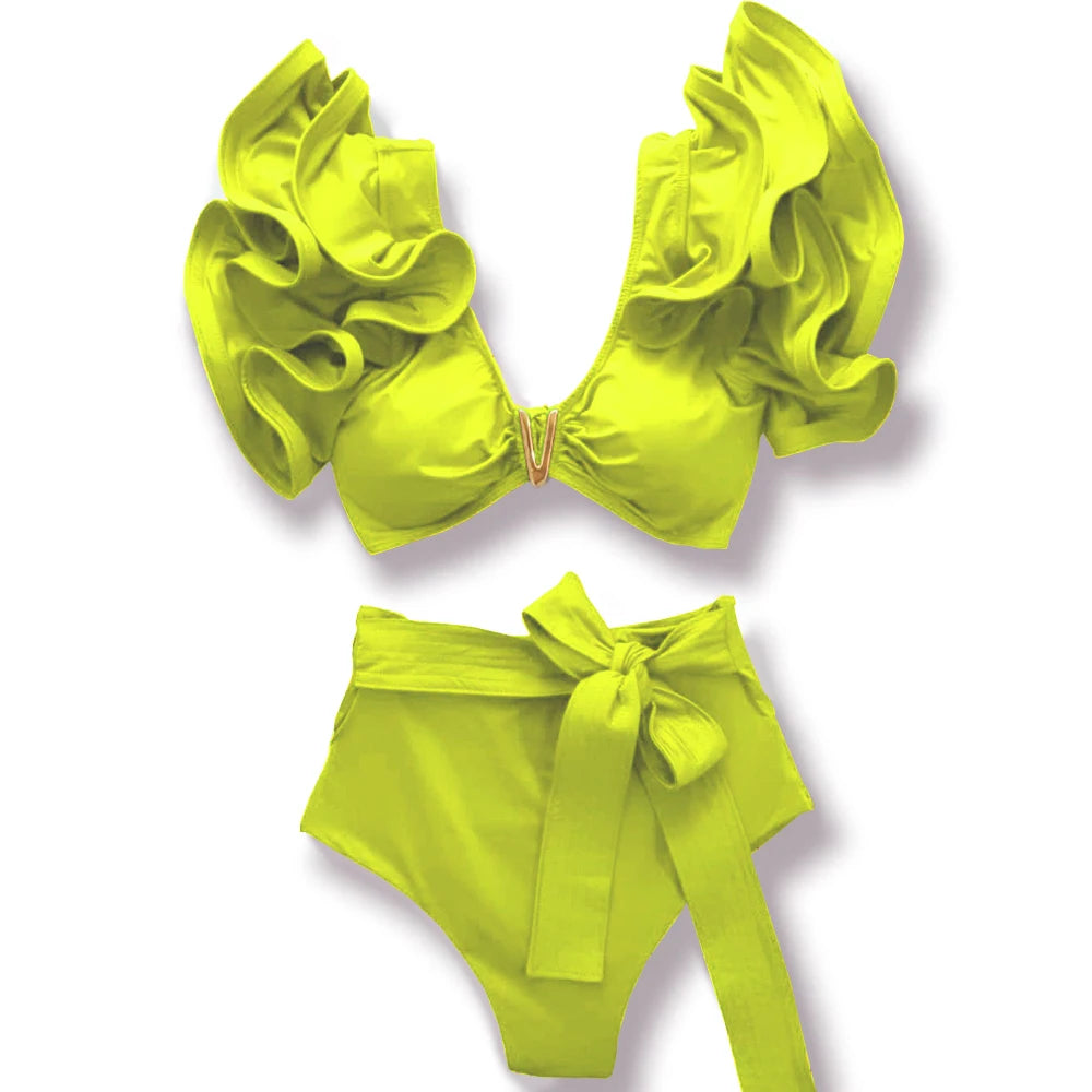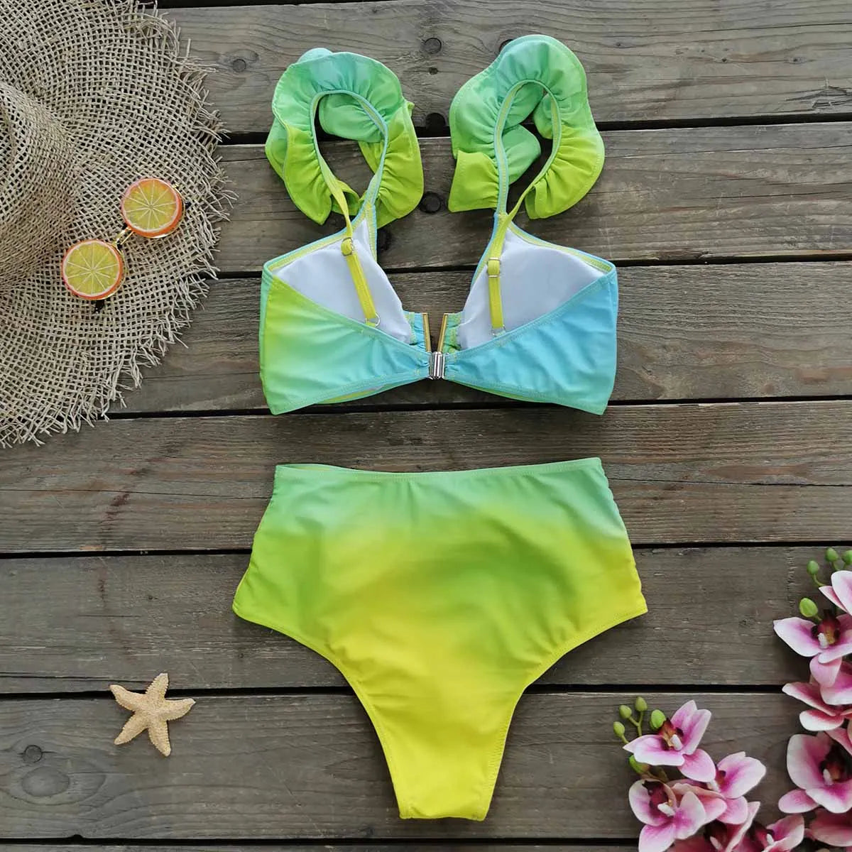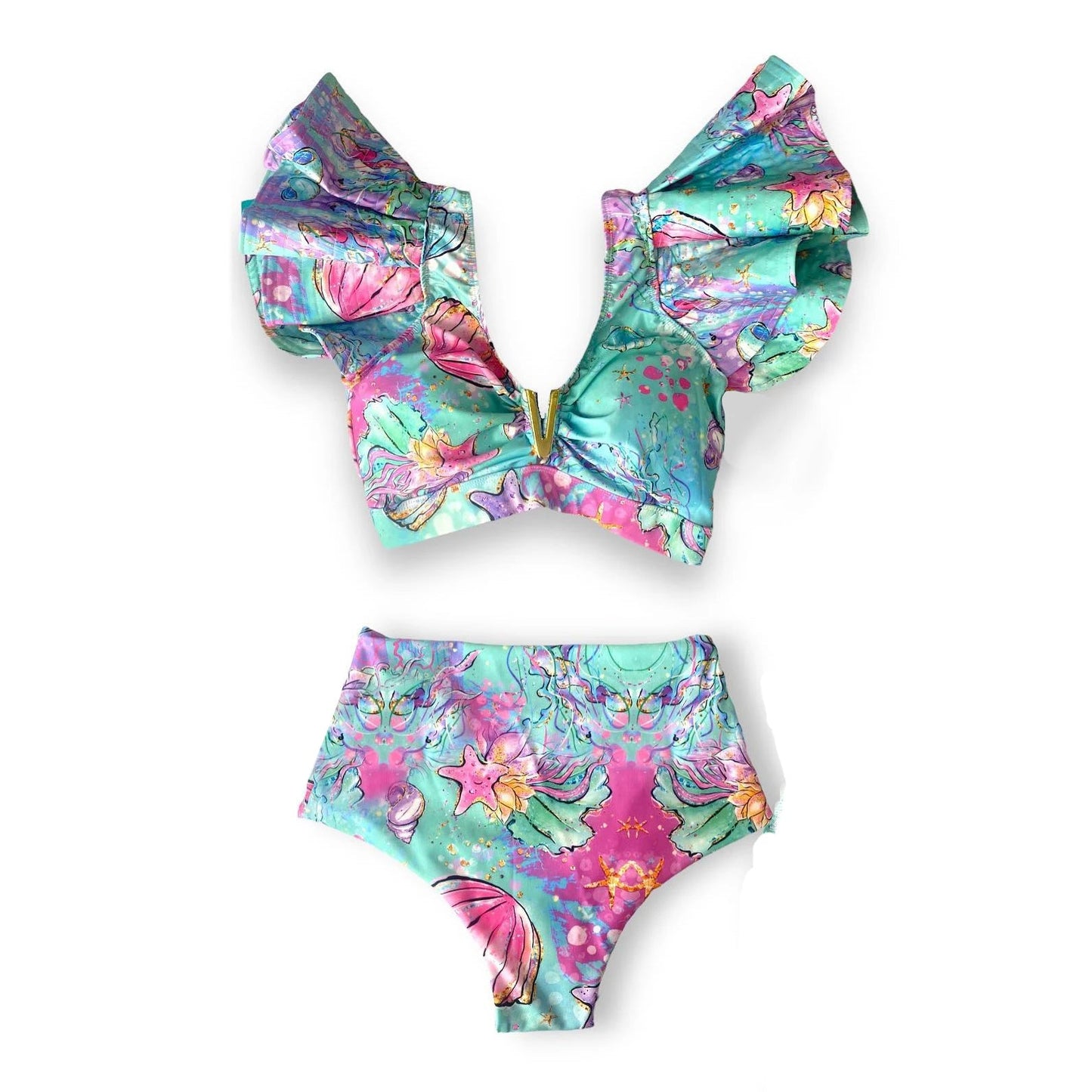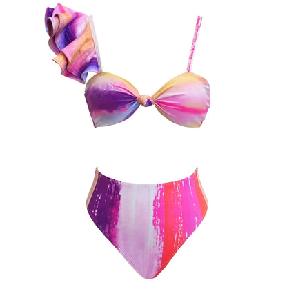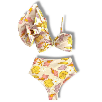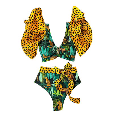 V-Neck High Waist Bikini Shoulder Ruffled Printed Swimsuit Two Piece Swimwear Bathing Suits