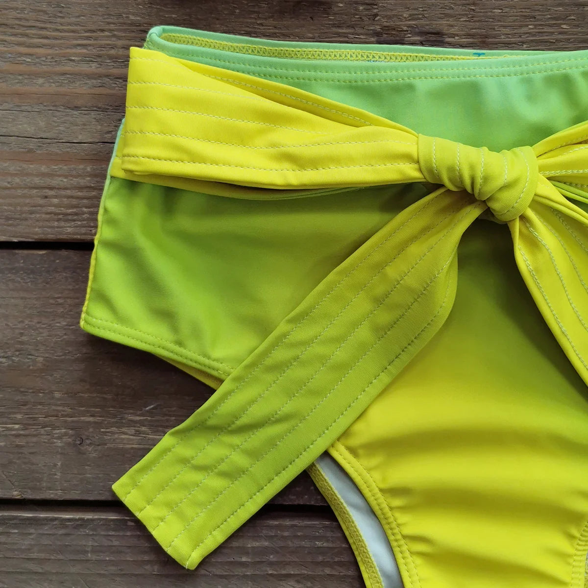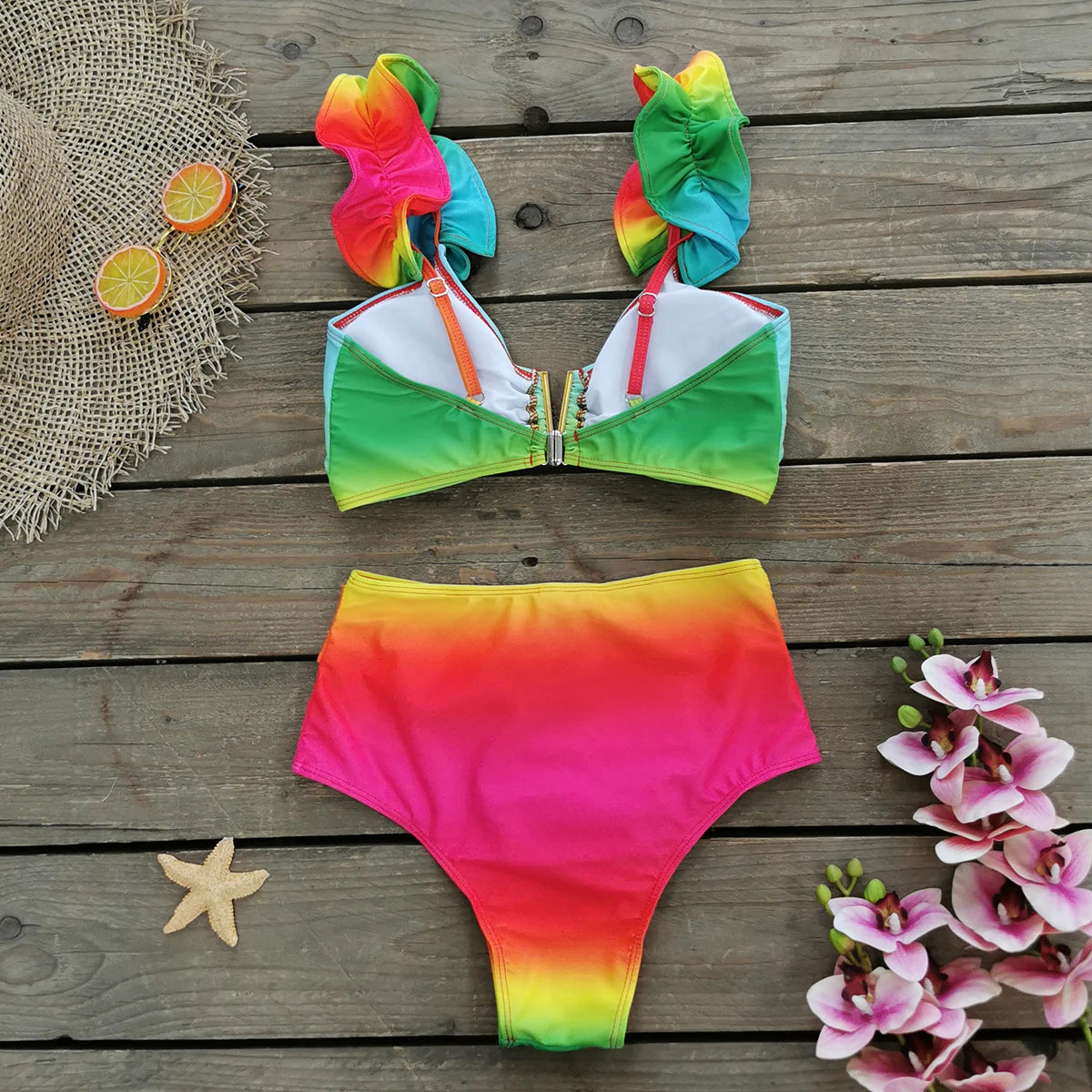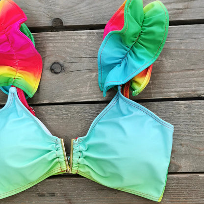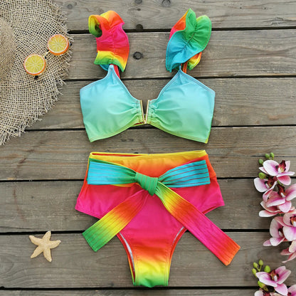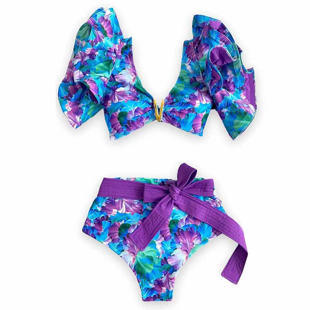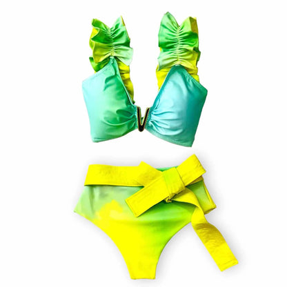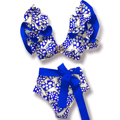V-Neck High Waist Bikini Shoulder Ruffled Printed Swimsuit Two Piece Swimwear Bathing Suits