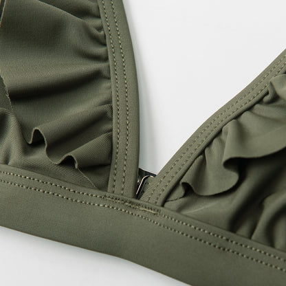 V-neck Ruffled High-waist Bikini Sets Swimsuit Women's Solid Brown Two Pieces Swimwear Beach Bathing Suits
