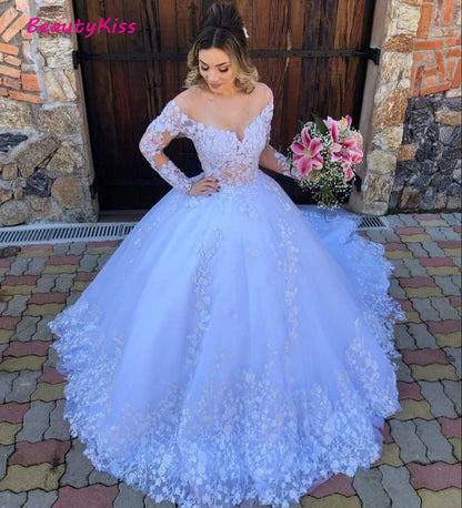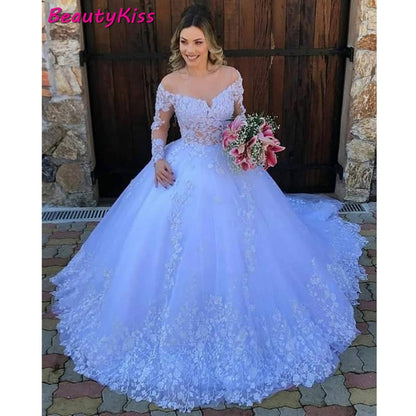 Princess Ball Gown Lace Appliques Long Sleeves Wedding Gowns Plus Size Robe Wedding Dress
