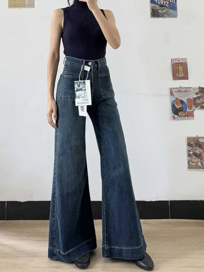 Women's Autumn Retro Micro-flared Solid Color High-waisted Straight Wide Leg Pants Loose Floor-length Jeans
