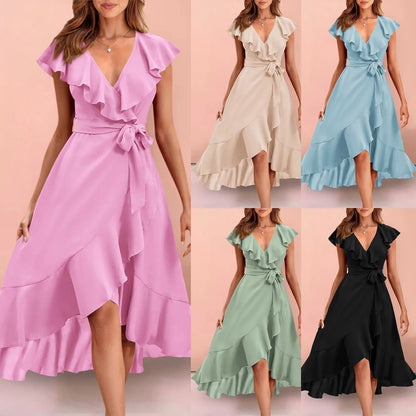 Pay in 4 instalments with AfterPay, Buy Now Pay LaterWomen's Boho Dress Ruffled Deep V Neck Irregular Long Dress Belted Short Sleeve Wrapped Double Layer Casual Beach Sundress