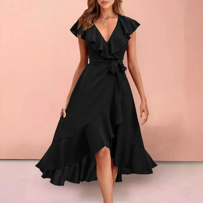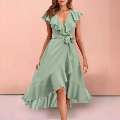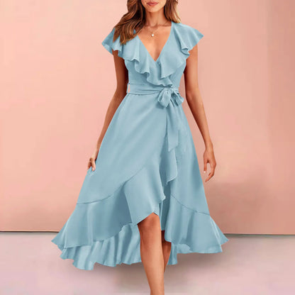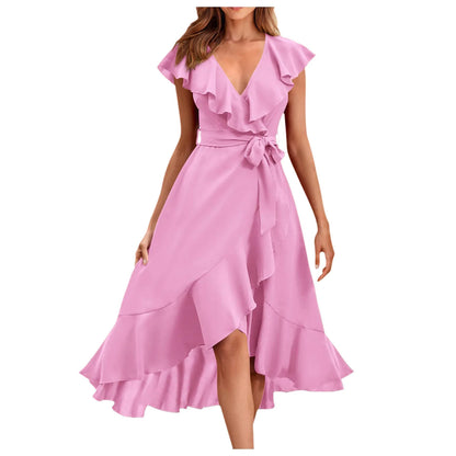 Women's Boho Dress Ruffled Deep V Neck Irregular Long Dress Belted Short Sleeve Wrapped Double Layer Casual Beach Sundress