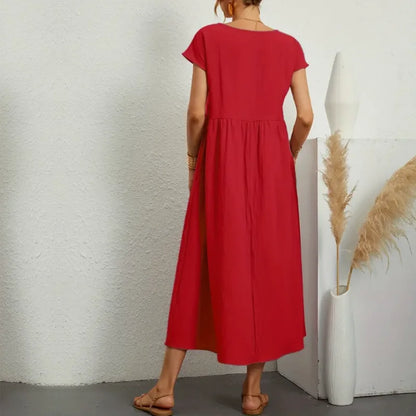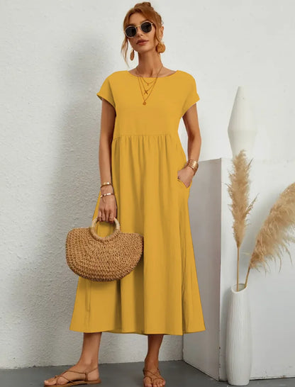 Women's Elegant Dress Summer Short Sleeve O-Neck Vintage Cotton Linen Comfortable Loose Pocket Long Dress