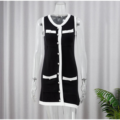 Women's Knitted O-neck Mini Dress Elegant Sleeveless High Waist Pleated Dresses