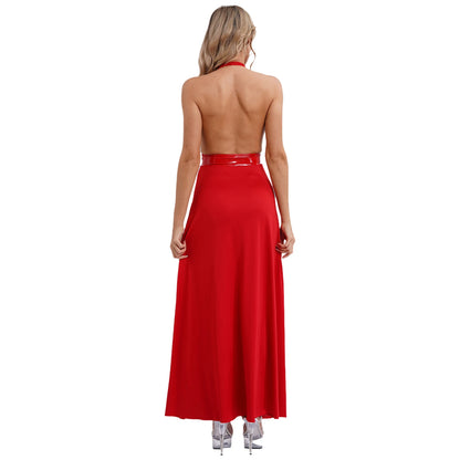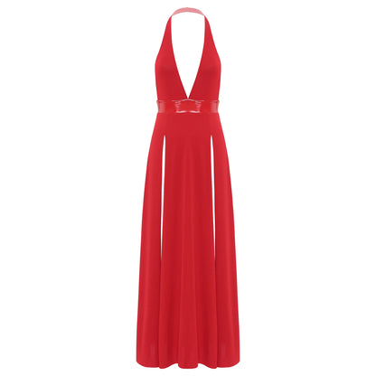 Womens Nightclub Deep V Neck Halter Backless Sleeveless Front High Split High Waist Coquette Clubwear Dress