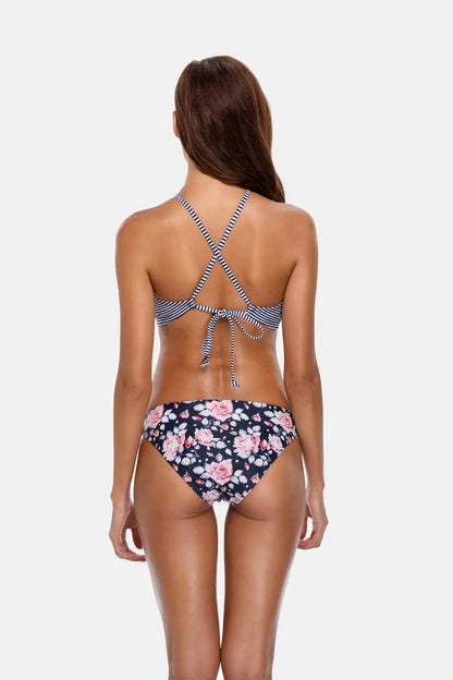 Women's Striped Bikini Set High Neck Swimsuit Vintage Floral Swimwear Strappy Bathing Suit Padded Beachwear